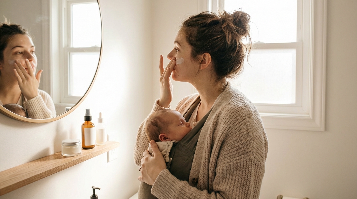 Mama, your skin will survive this newborn phase. It might be a little drier, a little more tired-looking (join the club), but it will be fine with just the basics. What matters right now is keeping it clean and hydrated while you focus on the tiny human who needs you.
