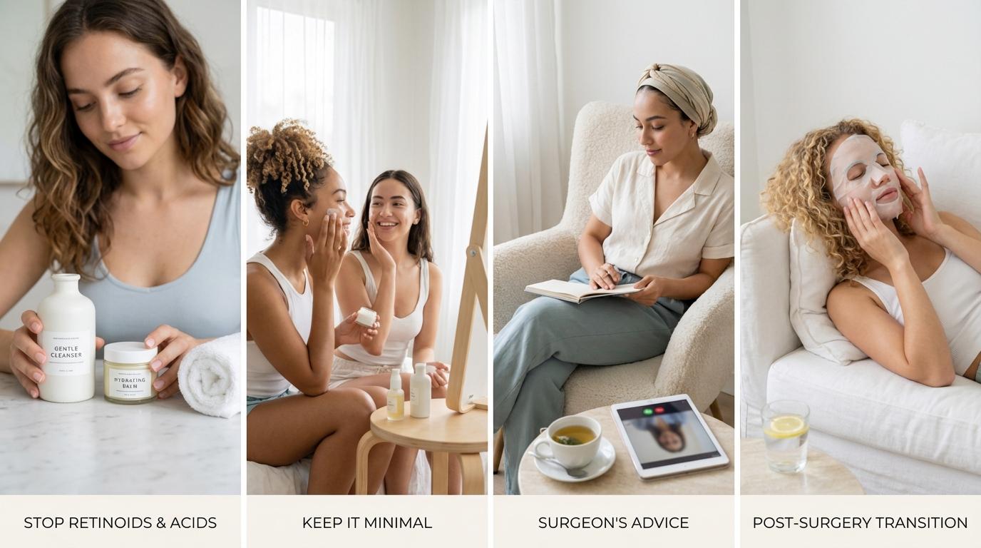 The temptation to jump back into your full routine immediately after surgery is real. Resist it. Your skin has been through a lot, and reintroducing active ingredients too soon can cause irritation, delayed healing, and potentially worse scarring.