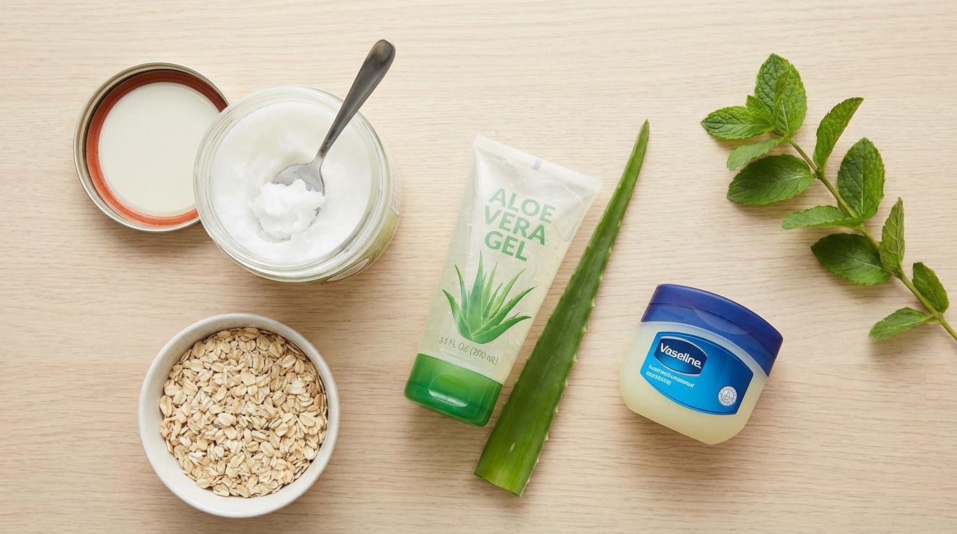 - Moisturizer: Aloe vera gel works great for lightweight hydration; Vaseline as an occlusive layer at night